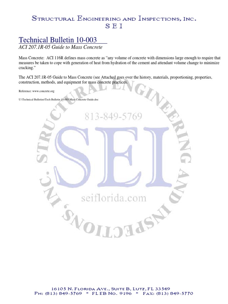 Search book title Enter keywords for book title search. It has become the practice of some designers of dams to specify the desired strength of mass concrete at later ages, such as at 1 or 2 years. This document contains a history of the development of mass concrete practice and a discussion of materials and concrete mixture proportioning, properties, construction methods, and equipment. The acj should be left free from protruding rock, deep footprints, vibrator holes, and other surface 207.1r-055.