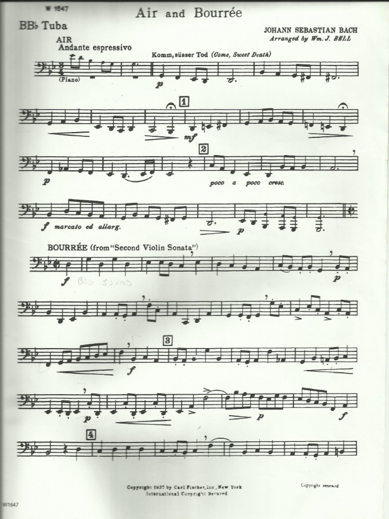 J.S. Bach Air and Bouree for Tuba and Piano arranged by William J. Bell, published by Carl Fischer score with separate part for Tuba UNUSED old music store. Bach, Johann Sebastian (Bell). Air & Bourree (Bell). Baroque. A classic solo for the tuba transcribed by the famous Bill Bell. W Category: Tuba Solos w/. Air and Bourree. Johann Sebastian Bach. Arranged by William J. Bell. Solo Part with Piano Reduction. Performing Ensemble: Tuba with Piano Instrumentation.