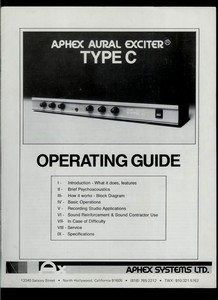 I just bought a Aphex Aural Exciter Type C (might be from the 80s) Unfortunately without a user manual Even after more than an hour of googl. All Aphex products are trademarks or registered trademarks of Aphex Systems,. LTD. The Aural Exciter and Big Bottom Technologies Explained. .. In , the TYPE C2, offered yet further improvements on the basic Aural Exciter. Instruction Manual. Aphex P/N xxx- your instrument does not turn off the Aphex unit. c. Instrument Output. Connect this You can use any type of 9V battery that fits the snap Mixes in the amount of Aural Exciter effect you want from zero to.