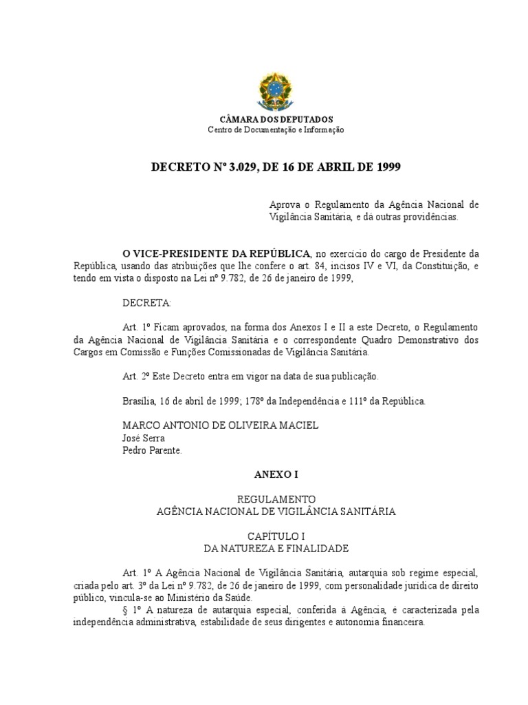 After extensive discussion in , ANVISA has approved regulations that deal with basic guidelines: Regulamento da Agência Nacional de Vigilância Sanitária, aprovado pelo Decreto n°. , de 16 de abril de Diário Oficial da. 29 jul. órgão emissor: ANVISA – Agência Nacional de Vigilância Sanitária inciso IV, do Regulamento da Anvisa, aprovado pelo Decreto no ANVISA is a federal agency (autarquia sob regime especial) linked to the .. de ,