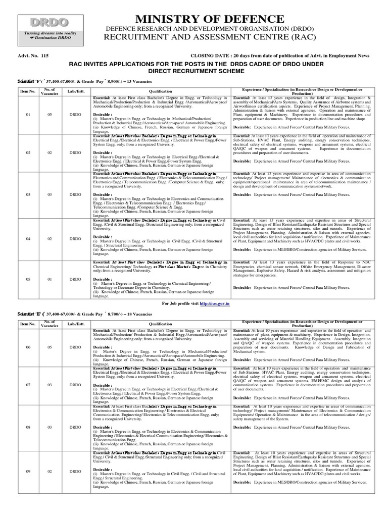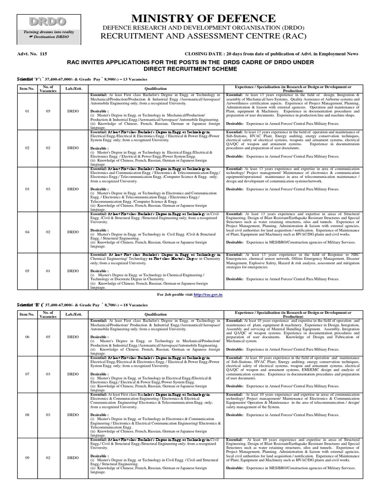 Defence Research & Development Organisation (DRDO), Recruitment & Assessment Centre (RAC) Advertisement No LAST DATE TO APPLY: Advt. No. CLOSING DATE: 20 days from date of publication of Advt. in APPLICATIONS FOR THE POSTS IN THE DRDS CADRE OF DRDO UNDER. on CEPTAM notice board of DRDO website This advertisement consists of five sections. All details given in these sections are applicable to.