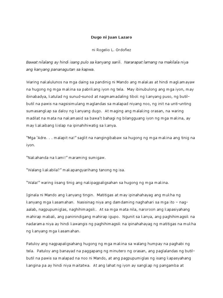 Dugo ni Juan Lazaro, Buhawi, Sa piling ng mga bituin, ni Rogelio L. Ordonez — Tata selo, Impeng negro, Quentin, ni Rogelio R. Sikat. Responsibility: nina Efren . Their short stories delved into the issues of the working class (Ordoñez’s “Buhawi ” and “Dugo ni Juan Lazaro”, Mirasol’s “Mga Aso sa Lagarian”. DUGO NI JUAN LAZARO. by li ren on 10 November Reusable. Product CompanyCareersSupportCommunityContactApps. English. español. 한국어.