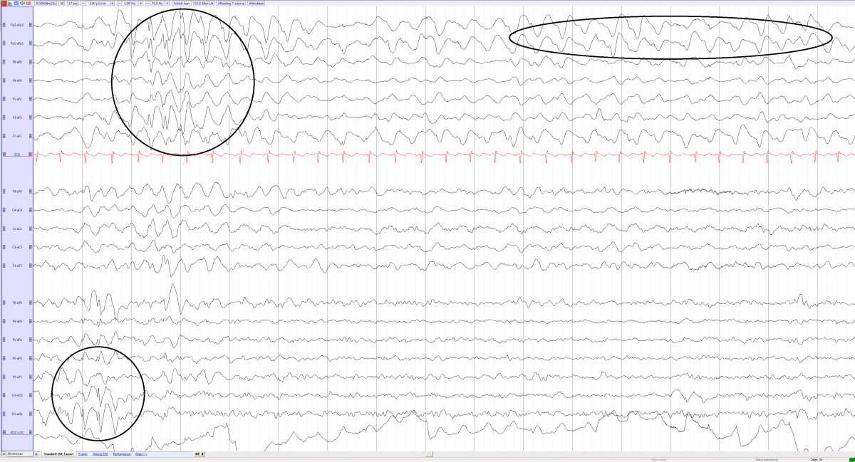 The pattern most frequently observed both in children and in adults has prolonged runs of high amplitude rhythmic Hz activity predominantly over the frontal regions with superimposed interictal epileptiform discharges.