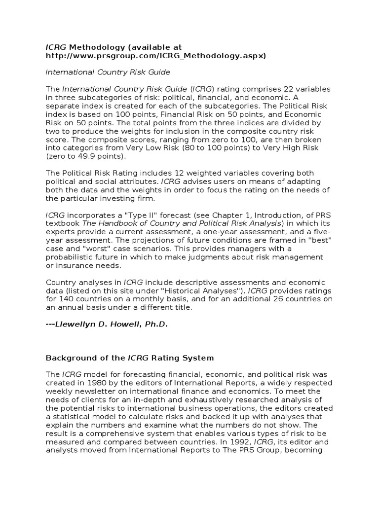ICRG Methodology – Download as PDF File .pdf), Text File .txt) or read online. View Essay – ICRG from FINANCE F at University of Dhaka. ICRG Methodology International Country Risk Guide The International. The ICRG Researcher’s Datasets provide annual time-series for country risk ICRG Methodology (PRS web site); Handbook of country and.