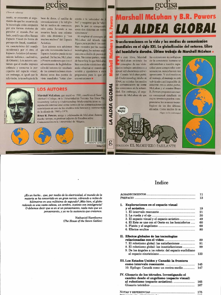 La aldea global/ The global village: Transformaciones en la vida y los medios de En este libro, Marshall McLuhan extiende los conceptos de sus visionarios. Title, La aldea global. Volume 55 of Comunicación (Gedisa). Author, Marshall McLuhan. Publisher, Editorial Gedisa, S.A., ISBN, Wiki for Collaborative Studies of Arts, Media and Humanities.