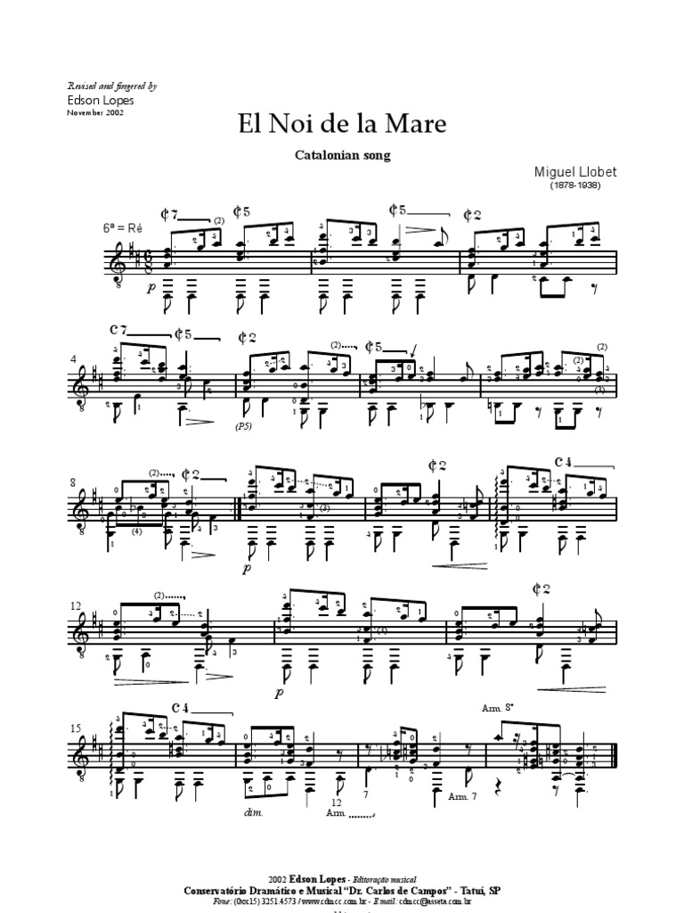 A bass pattern and the mid-range of the chords provide the rhythm section while the high strings provide the main melody. El Noi de la Mare—arranged by Miguel Llobet. Although in principle a simple piece, El Noi de la Mare features some difficult left hand sel, causing me to rate it of medium difficulty. You should also drop your elbow and pull your arm closer to your torso when switching from the Bm.