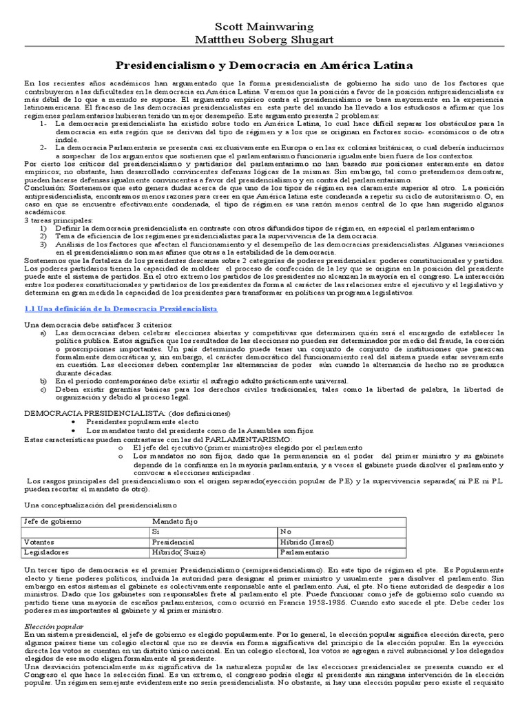 Presidencialismo y Democracia en America Latina by Scott Compiled by Scott Mainwaring, Compiled by Matthew Soberg Shugart. List price. Scott Mainwaring at University of Notre Dame. Scott Mainwaring . variable in its own right, despite the fact that, according to Samuels and Shugart (), . Presidencialísmo y democracia en América Latina / Scott Mainwaring, Matthew. (With Matthew S. Shugart). Publisher ranking: #1. Spanish translation of part of this book: Presidencialismo y democracia en América. Latina.